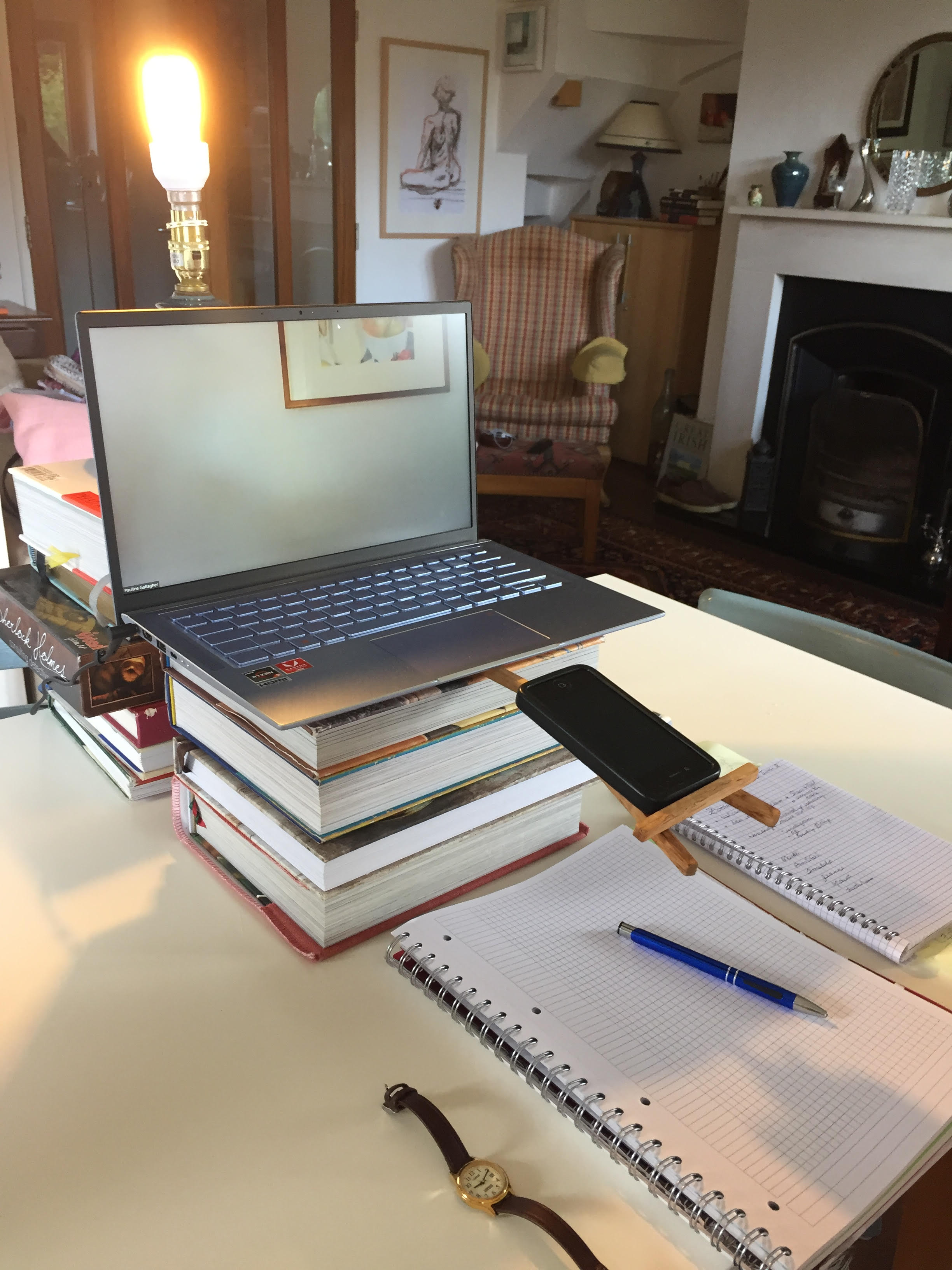 I used my i-phone a second webcam for overhead shots of my hands, set up a pile of books to have my laptop at the right level for ‘eye to eye’ contact with my students , found a suitable lamp to light the ‘set’ and began with a series of free zoom classes which were a learning curve for both myself and my students.